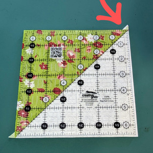 When squaring up your HSTs you put the diagonal (45 degree) line on your seam and then trim off the extra on all 4 sides. When the block is smaller than my ruler, I always leave a little extra if possible and trim 2 sides. Then rotate, line up on your 2 trimmed sides with the exact size you want, and trim the other 2 sides.