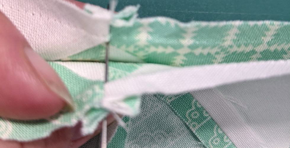 Then line up your opposing block seam and other point, and stick the pin directly into it from the right side.